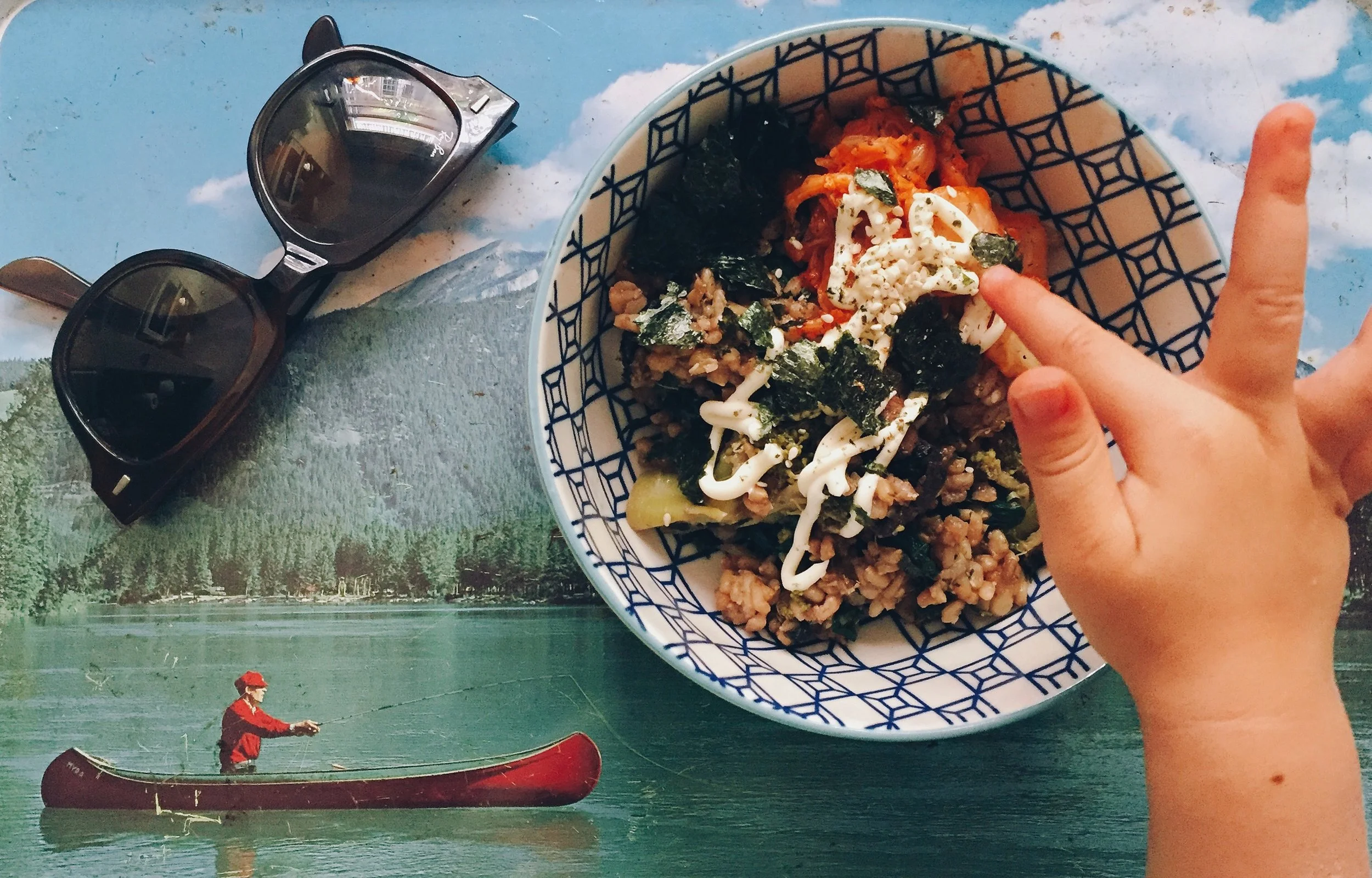 Cook brown rice according to pack. In a wok fry some broccoli, mushrooms and kale until they are a soft. Add some chopped ginger and garlic and miso mixed with water until combined. Add brown rice and mix. Sprinkle with torn up nori, sesame seeds, mayonnaise and optional kimchi.